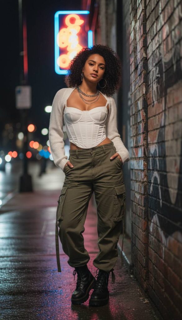 Balance the masculine energy of baggy, oversized cargo pants with the hyper-feminine structure of a corset top. Since it’s winter, look for cargos in heavier fabrics like denim or corduroy. Throw a bolero shrug over the corset so your arms don’t freeze while waiting for the Uber.