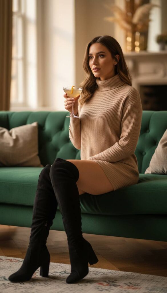 A sweater dress doesn’t have to look frumpy. Choose a ribbed knit with a high slit or a bodycon fit. The baddie element comes from the boots—thigh-high suede or leather boots that meet the hemline of the dress ensure zero skin is exposed to the wind, yet the implication is incredibly sexy.
