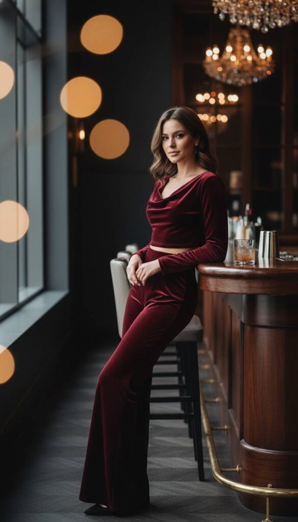 Velvet screams winter luxury. A matching velvet two-piece set (think cropped zip-up and flared pants or a skirt set) is comfortable enough for a lounge bar but hot enough for the VIP section. Choose jewel tones like emerald green, deep burgundy, or midnight blue.