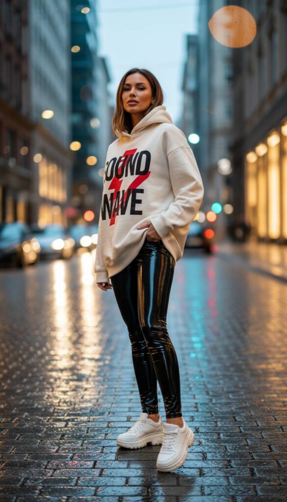 Vinyl leggings are the ultimate baddie staple. They are surprisingly warm because the material doesn’t breathe (beauty is pain, right?). Contrast the tight, shiny bottom with an oversized graphic hoodie or a vintage band tee. It’s a look that says ‘I didn’t try too hard, but I look better than everyone else.’