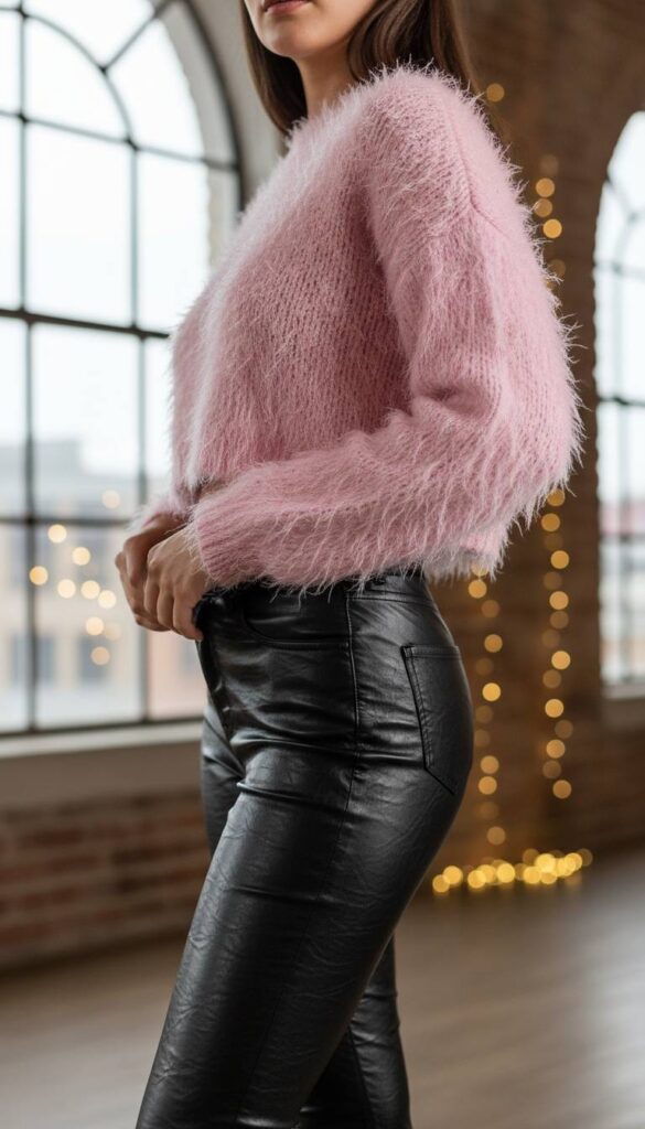 Texture mixing is the sign of a true stylist. Take your staple straight-leg leather trousers and soften them with a fuzzy mohair or eyelash knit crop top. The hard edge of the leather mixed with the soft, touchable top creates a perfectly balanced visual interest.