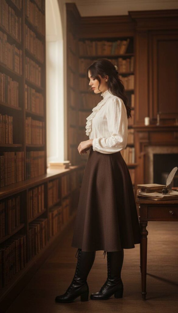 Tap into the Dark Academia trend with Victorian-style lace-up boots. Pair them with a structured A-line midi skirt and a tucked-in blouse. This look is scholarly yet stylish, perfect for library dates or museum visits. A leather satchel is the mandatory accessory here.