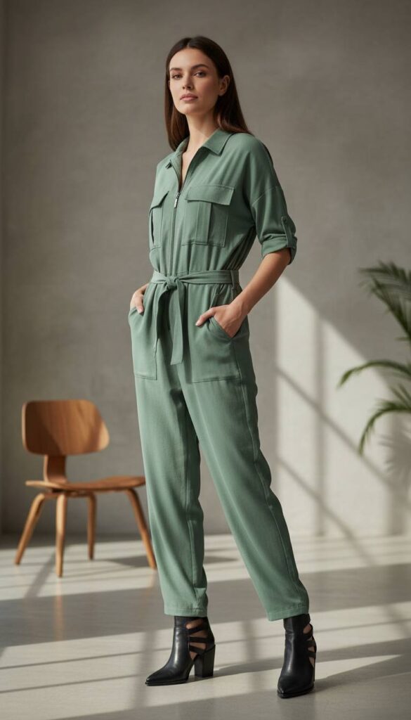 For a modern, architectural look, pair ankle boots featuring cut-out details with a utility jumpsuit. The boots add a touch of skin and complexity to the one-piece outfit. Cinch the jumpsuit at the waist and roll the hem slightly to highlight the unique design of the footwear.