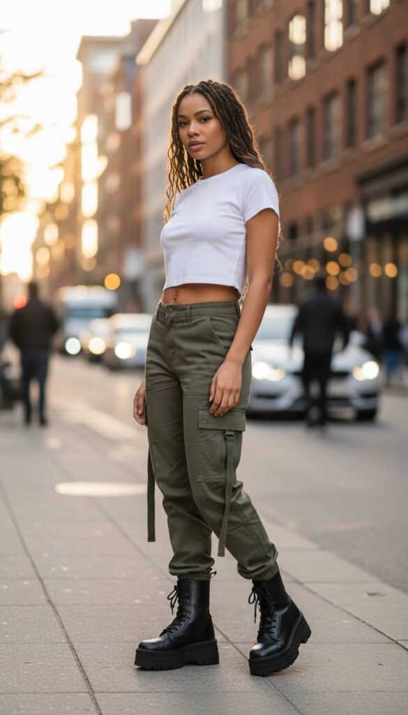 Embrace the Y2K revival with chunky platform boots and wide-leg cargo pants. This utilitarian look is practical and trendy. Pair it with a fitted baby tee or a crop top to balance the volume of the pants and boots. Accessorize with a beanie for maximum street style points.