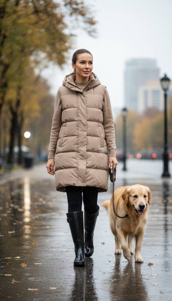 Practicality doesn’t have to mean sacrificing style. Pair sleek, Chelsea-style rubber rain boots with thick leggings and a long-line puffer vest. This is the ideal outfit for running errands on gray, rainy days while still looking pulled together and intentional.