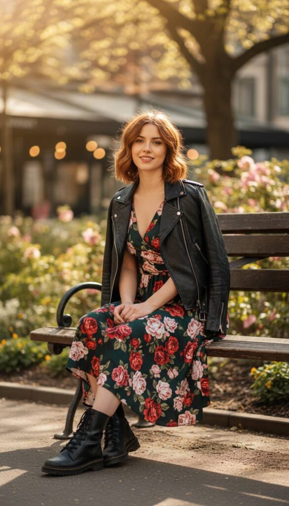 Play with contrasts by pairing heavy, lace-up combat boots with a soft, flowy floral midi dress. The juxtaposition between the grunge footwear and the feminine fabric creates a balanced, edgy aesthetic that works beautifully for transition seasons. Throw on a leather jacket if the temperature drops.
