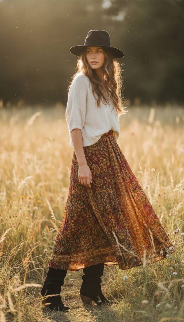 Create movement and texture by pairing slouchy suede boots with a long, printed bohemian maxi skirt. The weight of the boot anchors the light fabric of the skirt. Add a felt fedora hat and a chunky cardigan to fully embrace the free-spirited, artistic vibe.
