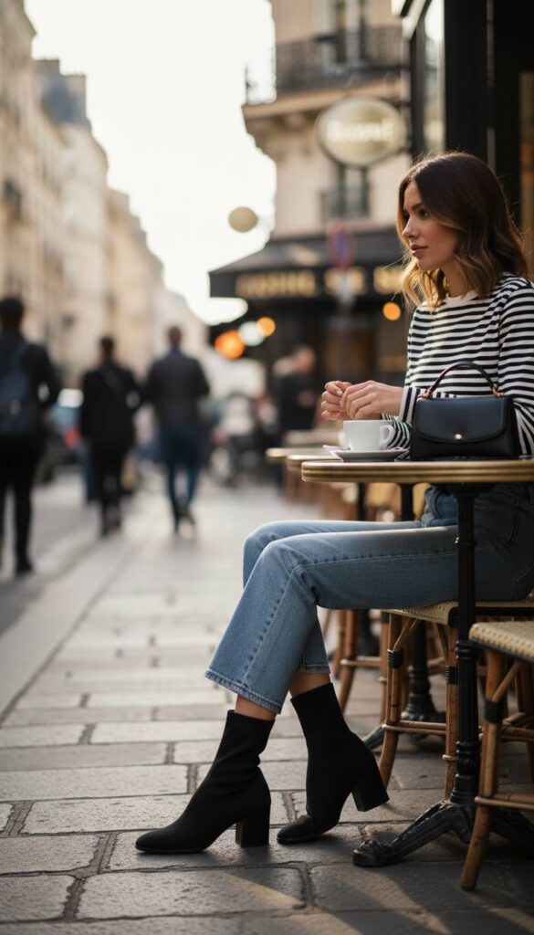 For a seamless, Parisian-inspired look, style tight-fitting sock boots with cropped flare jeans. The crop should end exactly where the boot begins, ensuring no skin is showing for a continuous line. Pair with a striped Breton top and a red lip for instant French girl chic.