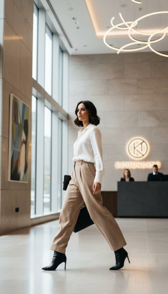 Make your boots work for the office by styling pointed-toe booties under wide-leg tailored trousers. The pointed toe peeking out extends the leg line and looks incredibly sharp. Finish the look with a crisp button-down shirt and a structured trench coat for a powerful executive aesthetic.