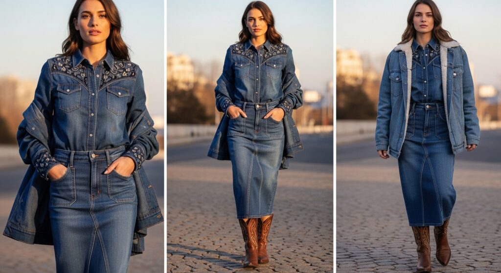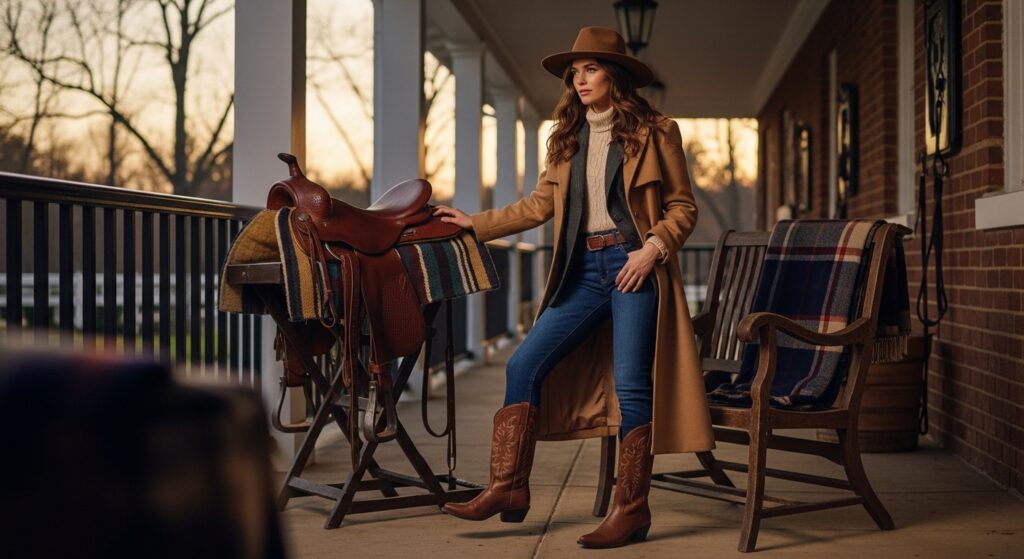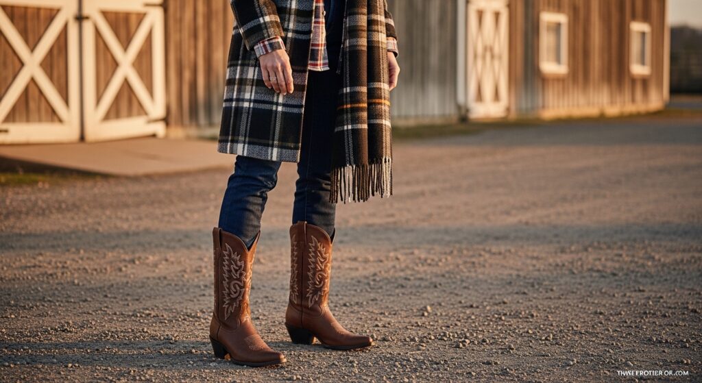 The denim-on-denim look gets a chic western upgrade with brown cowboy boots. Pair your favorite jeans with a well-fitted denim jacket in a slightly different wash to create some visual separation. The boots serve as the perfect anchor, tying the whole rugged-yet-fashionable look together. It’s a bold and confident statement. For a classic top layer, the Wrangler Authentics Women’s Denim Jacket is an iconic choice.