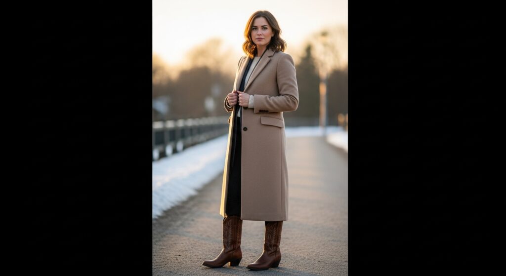 For a truly elegant winter look, layer a long wool coat over your outfit. Let your brown cowboy boots peek out from beneath the hem for an unexpected and stylish twist. This works beautifully over a simple base of jeans and a turtleneck, creating a sophisticated silhouette that’s perfect for city strolls or a chilly evening. If you’re looking for a chic outerwear piece, the chouyatou Women’s Big Notched Lapel Wool Blend Coat is a highly-rated choice.