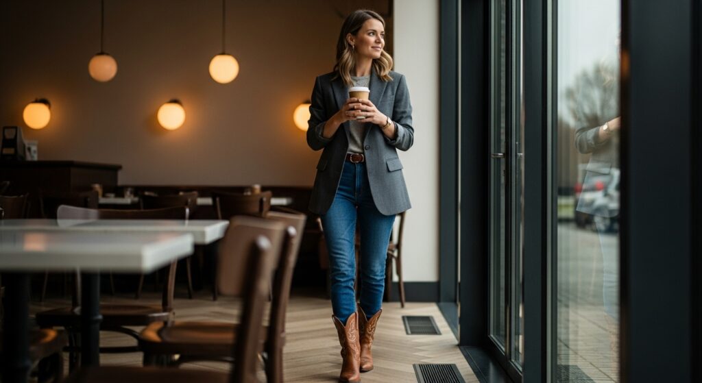 Elevate a simple jeans-and-tee combination by adding a structured blazer. This simple addition instantly makes the outfit look more polished and intentional. When you add brown cowboy boots to the mix, you create a perfect balance between sharp tailoring and rustic charm. It’s a versatile look that can take you from the office to after-work drinks with ease. A highly versatile option is the Cicy Bell Women’s Casual Blazer.