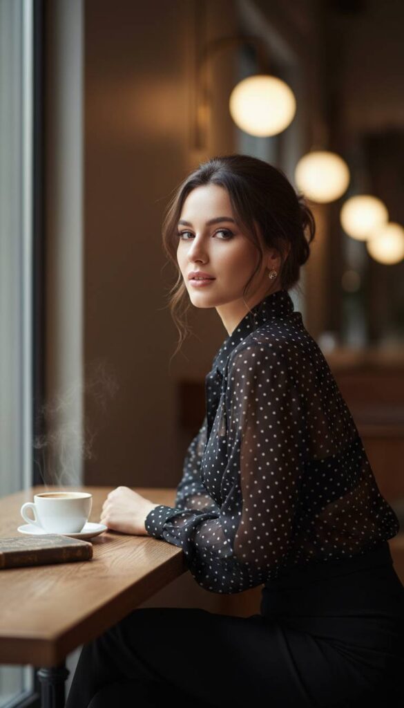 Embrace the sheer trend by layering a see-through organza or mesh blouse over a solid lace bralette. This look is edgy and sophisticated. To balance the top, pair it with tailored trousers or faux leather pants. It is a bold statement that says you are not afraid to be seen.