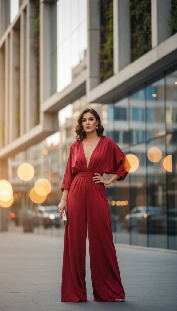A jumpsuit is a one-and-done wonder that elongates the entire frame. A deep V-neckline adds a dose of sex appeal to the streamlined silhouette. Choose a bold color like red or emerald green to really stand out among the crowd.