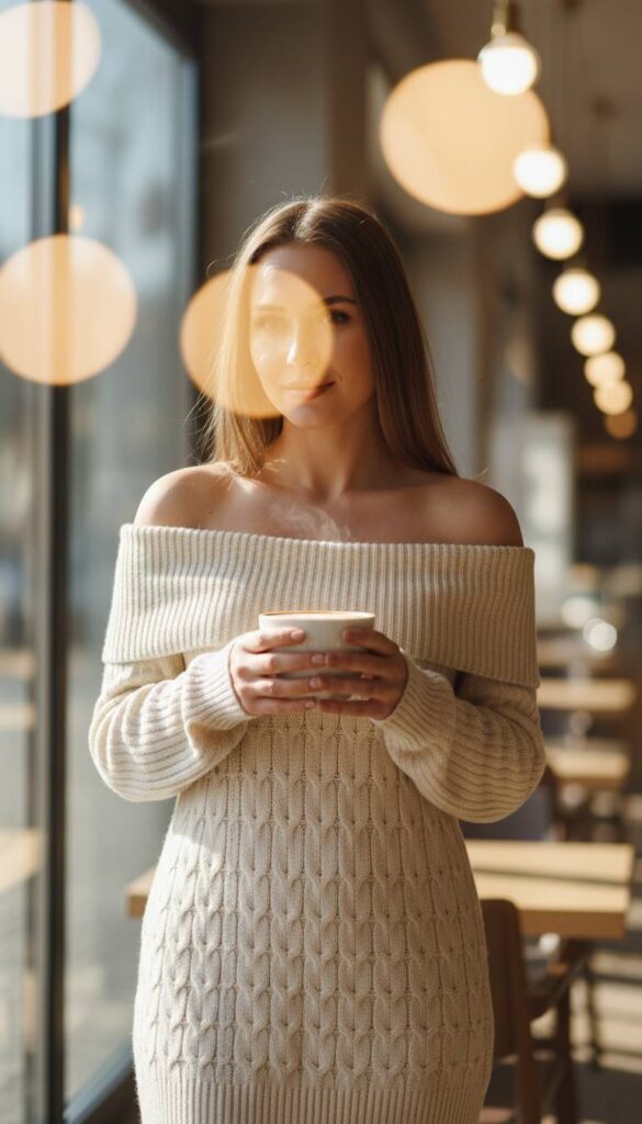 There is something incredibly sensual about the collarbone and shoulders. An off-the-shoulder knit dress clings to the body and frames the face beautifully. It is cozy yet chic, making it perfect for fall or spring brunch dates where you want to look hot without freezing.
