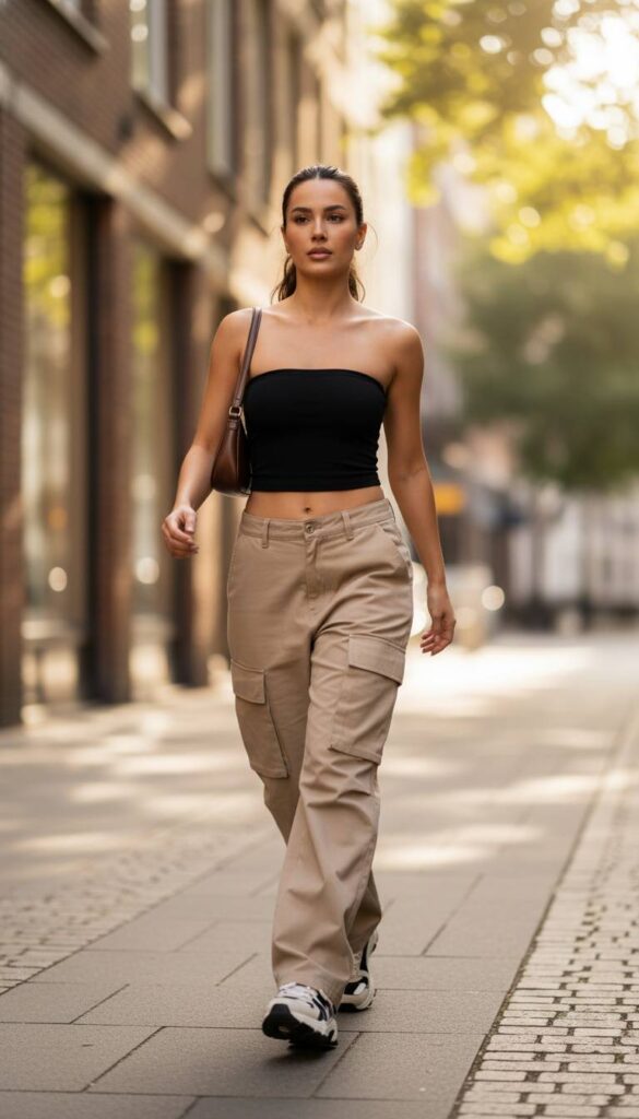 The Y2K revival is here to stay. Contrast a tiny, skin-tight tube top with baggy utility cargo pants. This look highlights the shoulders and waist while offering a tough, street-style edge. It is sexy in a sporty, tomboyish way.