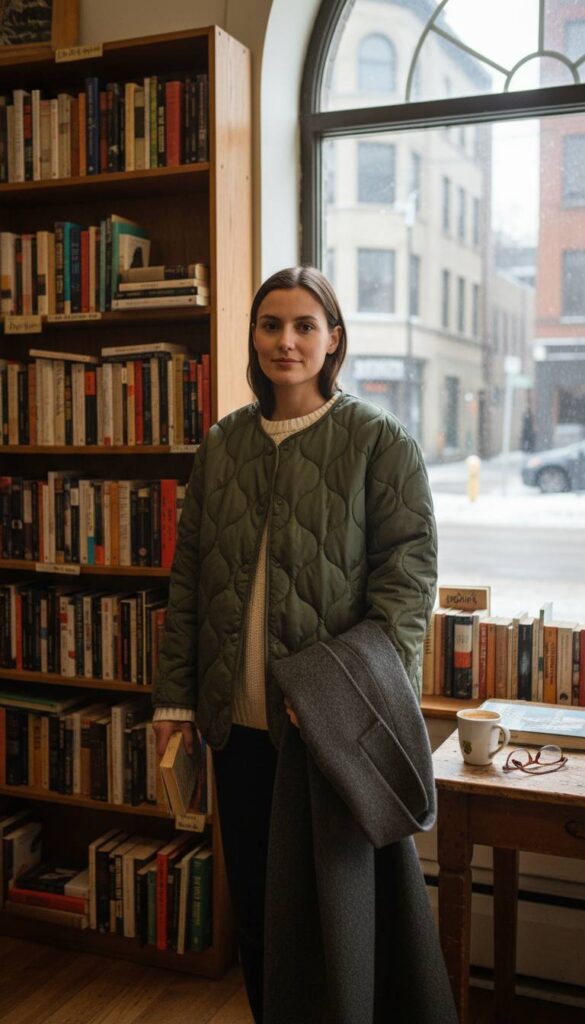 Emanating effortless cool, the onion quilted liner jacket is a Chicagoan’s secret weapon for navigating fluctuating indoor and outdoor temperatures. Picture its distinctive, rounded stitching catching the soft, diffused light of a Logan Square bookstore window. This collarless, often boxy silhouette, rendered in a matte olive green nylon, offers surprising warmth without the bulk of a traditional puffer. It layers beautifully over a chunky fisherman sweater or a simple cashmere crewneck. Imagine slipping off your heavy wool overcoat upon entering the Art Institute, revealing this stylish, lightweight layer that feels more like a fashion statement than a purely functional piece, providing comfort and polish during a long afternoon of gallery hopping.