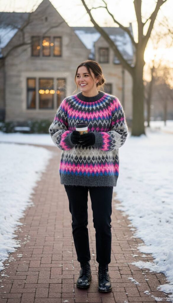 The Fair Isle sweater has been elevated from a ski lodge classic to a high fashion staple. This season, the look is about modern interpretations: think traditional patterns rendered in unexpected color combinations like neon pink and charcoal, or lavender and olive. A slightly oversized, boxy fit in a soft merino or alpaca blend feels contemporary and allows for layering. It’s the perfect one piece solution for looking put together and festive for a gathering in Lincoln Park. The intricate pattern provides enough visual interest to be the star of the outfit, requiring only simple trousers and boots to complete a cozy yet chic look.