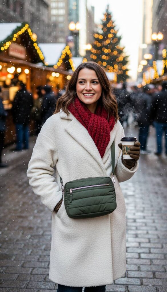 The winter dilemma: a bag large enough for essentials but small enough not to be cumbersome over a bulky coat. The solution is a structured crossbody crafted from weather resistant materials like nylon or coated canvas. Look for one with subtle quilting for a touch of insulation, protecting your phone battery from dying in the extreme cold. A minimalist design in a deep olive green or slate grey with gunmetal hardware maintains a sleek profile. It keeps your hands free for a warm coffee and sits securely against your body, making it a practical and stylish choice for navigating crowded holiday markets.