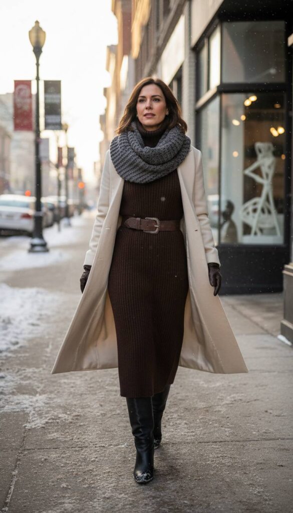 A heavy gauge knit dress is a one and done winter outfit solution that exudes effortless elegance. Look for a midi length style with a high neckline or turtleneck, crafted from a dense merino wool or thick ribbed cotton blend that holds its shape. A straight, column like silhouette is modern and flattering, especially when cinched with a leather belt. In a solid color like black, cream, or a deep espresso brown, this dress becomes a versatile canvas. It pairs beautifully with tall boots and a long overcoat, offering a comfortable, warm, and supremely chic option for office days or evening gallery crawls.