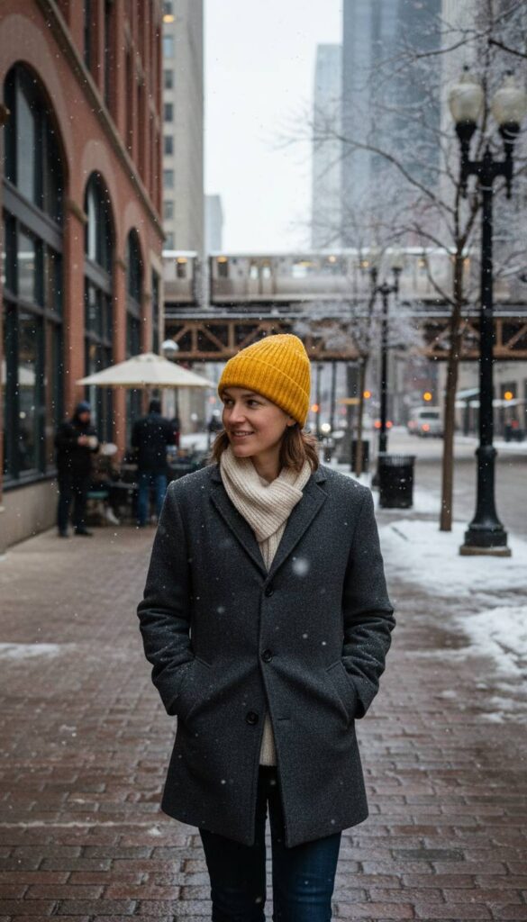 A quality beanie is the final, crucial piece of the winter armor. Upgrade from basic acrylic to 100% cashmere. The difference in warmth and softness is profound. The current silhouette is less about a slouchy, relaxed fit and more about a clean, snug profile that sits neatly on the head. A ribbed texture adds visual interest. Opt for a versatile neutral like heather grey or oatmeal, or choose a bold color like marigold yellow to act as a bright, cheerful accent against the grey city sky. It’s a small luxury that makes a huge difference in comfort and completes any outfit with a touch of polish.