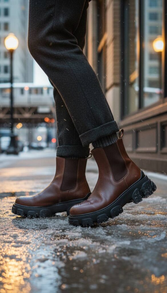 Navigating icy, salted sidewalks requires footwear that is both tactical and chic. The elevated lug sole Chelsea boot is the undisputed champion. We’re seeing exaggerated, almost sculptural rubber soles providing serious traction, paired with sleek, waterproof leather uppers in a classic black or a modern espresso brown. The beauty lies in the contrast: the rugged, utilitarian base supports a refined, polished silhouette that works seamlessly with tailored trousers or thick knit tights. This is the footwear that takes you from a slippery commute on the L to a sophisticated dinner in the West Loop without missing a beat, embodying urban resilience.