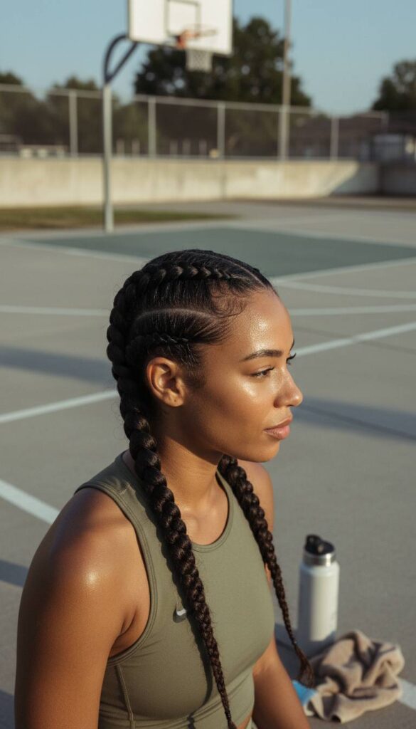 The Dutch braid, or inverted French braid, creates a bold, raised plait that sits on top of the hair. While a single Dutch braid can be tricky for beginners, creating two pigtails is far more manageable, allowing you to focus on one side at a time. The aesthetic is clean and sporty, but can be softened by pulling the sections apart for a fuller look. A slick of high hold pomade along the parting and hairline ensures a crisp, graphic finish, eliminating flyaways and emphasizing the braid’s structure. This style projects an image of controlled confidence and athletic chic.