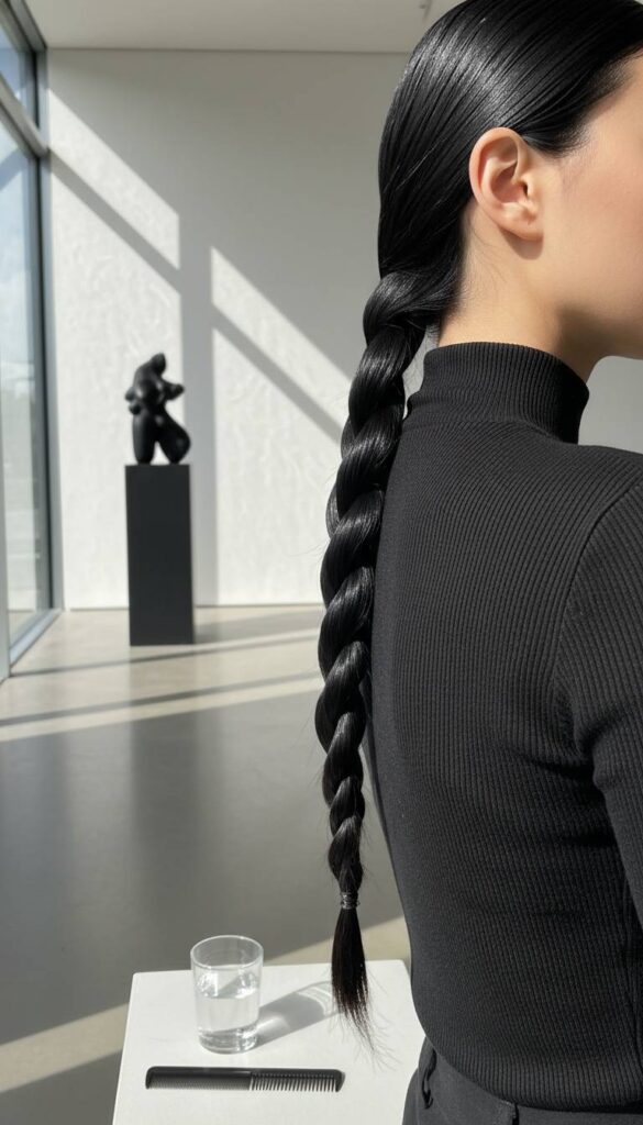 This is the antithesis of the bohemian braid. The rope braid, composed of two tightly twisted strands, derives its power from its liquid like, almost supernatural sheen. The goal is a flawless, light reflective surface that appears meticulously crafted. This effect is not achieved by tension alone, but by a humidity blocking, smoothing serum applied to damp hair before blow drying. Think of a single, obsidian cord catching the light in a minimalist art gallery. It’s a statement of severe elegance that requires zero complex weaving skills, making it a secret weapon for creating a high fashion look in minutes.