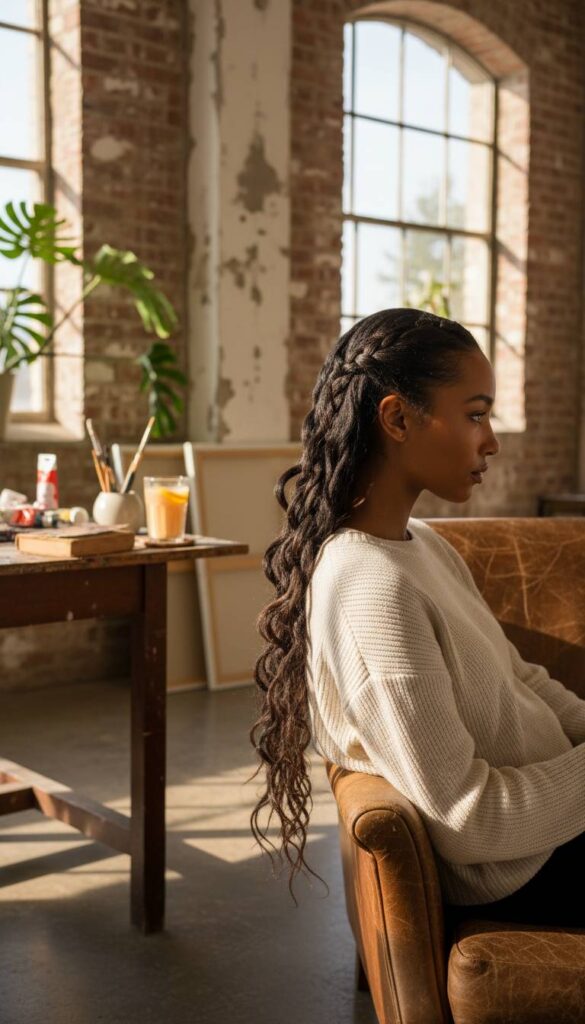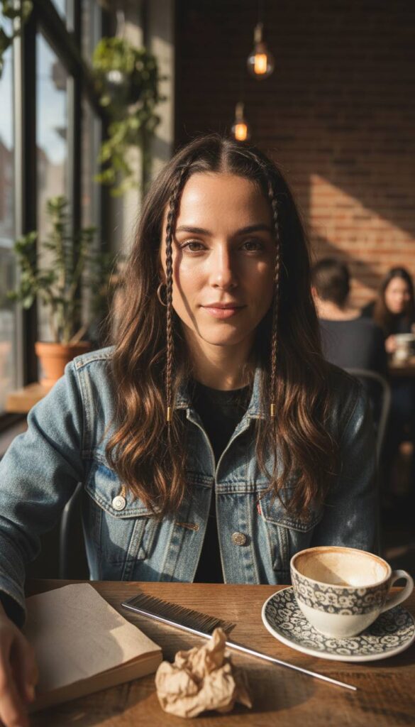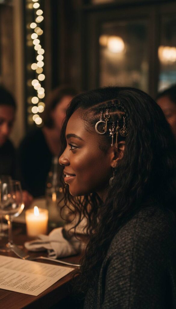 This micro trend focuses on the braid as a canvas for jewelry. A single, small, often hidden braid is woven into the hair and then adorned with a collection of metallic rings, cuffs, or symbolic charms. The effect is a subtle flash of metal glimpsed as the head turns, a private detail made public. The setting is a dimly lit concert or an intimate dinner, where the charms catch the light. This is less about the braid itself and more about personalization, allowing for a form of self expression that feels both curated and deeply individual, like a secret story woven into the hair.