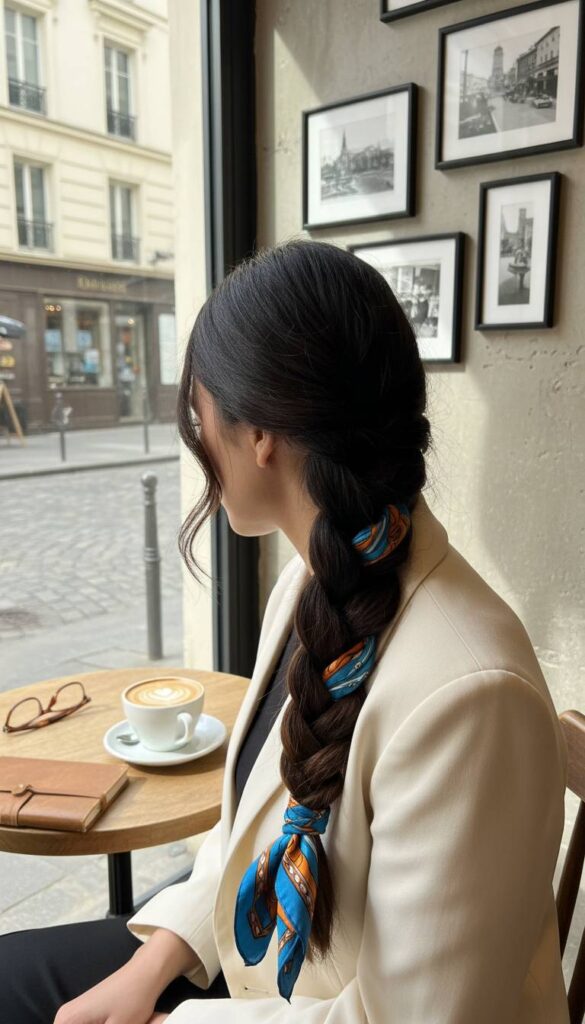 Incorporating a silk scarf is the fastest way to add volume, color, and an element of couture to a basic three strand braid. The scarf acts as one of the three strands, instantly thickening the plait and introducing a new texture and pattern. The visual contrast between the soft hair and the smooth, printed silk is what elevates the look. Imagine a vibrant Hermes inspired pattern of cerulean blue and burnt orange woven through deep espresso hair. It’s a technique that transforms a simple hairstyle into a complete accessory, tying together an outfit with a single, elegant gesture.