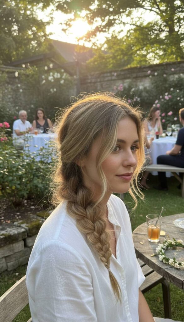 The lo-fi fishtail thrives on imperfection. Unlike its tighter counterparts, this version is about creating a soft, almost crumbling texture that suggests romance and ease. The technique involves gently pulling apart each woven section—a process known as ‘pancaking’—to create airiness and width. The magic lies in the details: a few face framing tendrils left loose, the texture slightly tousled as if by a sea breeze. It’s less about a perfect weave and more about evoking a mood. The setting is a late afternoon garden party, the light golden and hazy. Use clear elastics to maintain the illusion of a braid that is barely holding itself together.