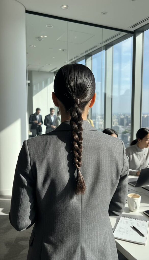 This style combines the sharpness of a sleek low ponytail with the textural interest of a braid. The critical first step is creating an impeccably smooth, flyaway free base. This is achieved with a boar bristle brush, which smooths the hair cuticle to create a glossy, uniform surface. Once the ponytail is secured tightly at the nape of the neck, a simple three strand or fishtail braid completes the look. The contrast between the severe, smooth top and the woven texture of the braid is what makes this style so visually compelling and boardroom appropriate.