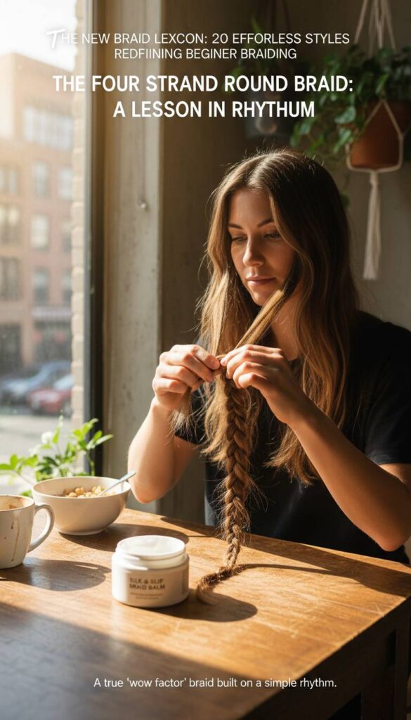 While it sounds intimidating, the four strand braid is often easier for beginners to master than a French braid. It follows a simple, repetitive ‘over and under’ pattern that quickly becomes muscle memory. The result is a beautiful, intricate round braid that looks incredibly complex and skillful. To keep the four strands separate and manageable during the learning process, a smoothing cream is essential. It prevents frizz and gives the hair just enough slip to pass the strands smoothly without tangling. It is a true ‘wow factor’ braid built on a simple rhythm.