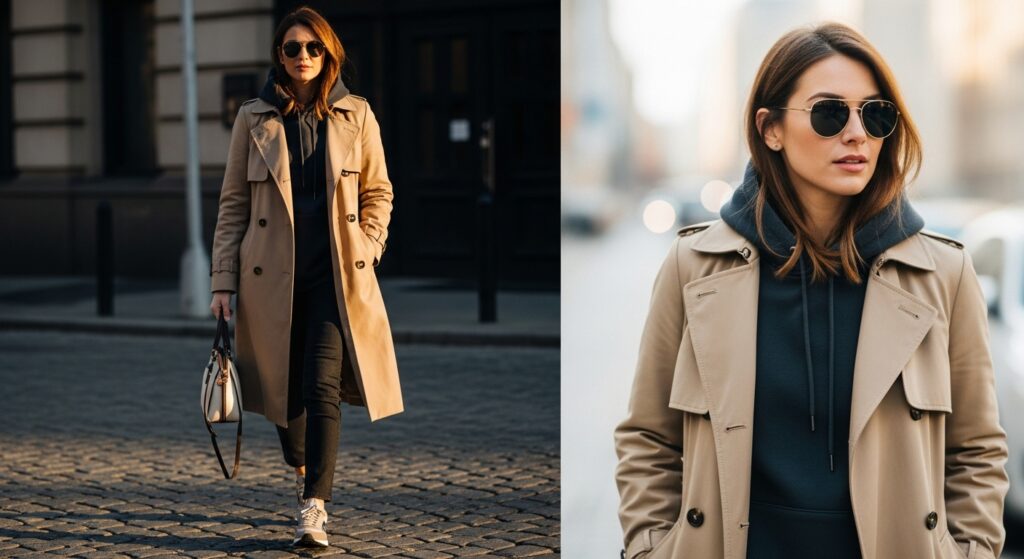 Blending sophistication with casual comfort, the trench coat over a hoodie is a street-style staple. This high-low mix creates a dynamic look that’s perfect for transitional weather or milder winter days. The hoodie’s hood peeking out from the trench’s collar adds a playful, urban edge to a timeless outerwear piece. For a versatile base, we recommend the Hanes Women’s EcoSmart Hoodie.