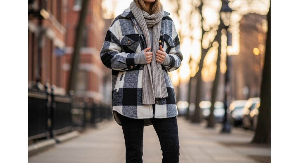 Embrace ultimate comfort without sacrificing style by pairing fleece-lined leggings with an oversized shirt-jacket, or ‘shacket.’ This combination is your go-to for casual errands or cozy weekends. The shacket provides the structure of a jacket with the comfort of a flannel, while the leggings offer warmth and flexibility. You can find excellent CRZ YOGA Fleece Lined Leggings on Amazon to build this outfit.