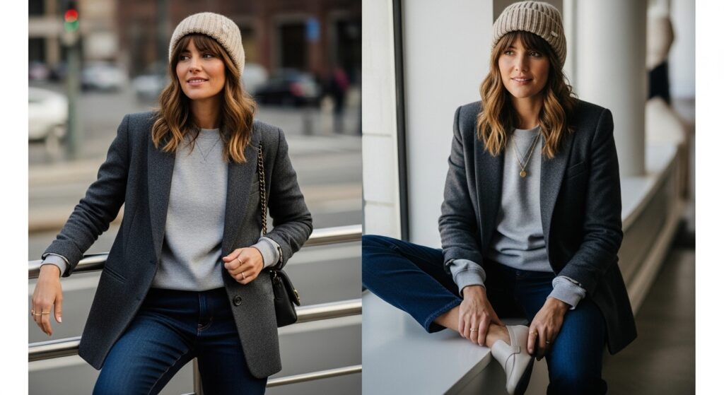 Elevate your favorite casual sweatshirt by layering a structured blazer over it. This modern pairing perfectly marries smart and casual aesthetics, creating a look that’s both comfortable and incredibly chic. It’s a stylish uniform for the creative professional or anyone looking to add a polished twist to their weekend wear. An Oversized Casual Blazer from Cicy Bell can truly complete this outfit.