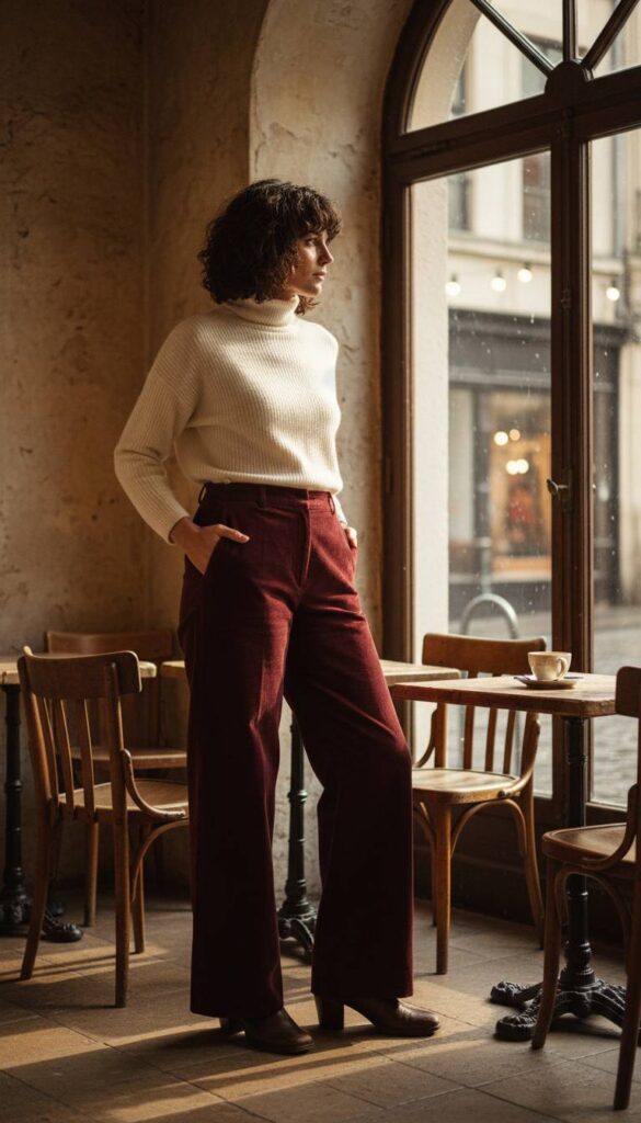 Corduroy is back, but not in its collegiate, stuffy form. This season reimagines the textile in a high rise, wide leg silhouette that is pure 1970s elegance. Envision a fine wale corduroy in a rich cognac brown or a deep merlot, possessing a velvety sheen under soft light. The fabric’s inherent structure allows it to drape beautifully from the hips, creating a continuous, sweeping line that balances proportions and feels utterly powerful. Paired with a simple cashmere turtleneck and a heeled boot, these trousers offer a textural richness that denim cannot match, proving that comfort and high fashion can be a perfect pairing for the colder months.