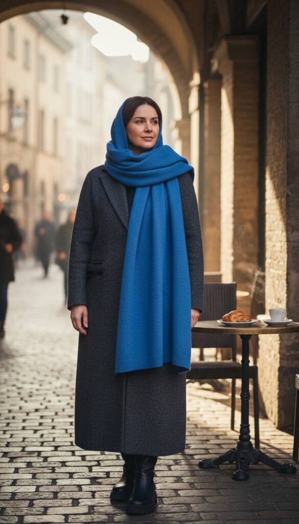 More than a mere accessory for warmth, the oversized cashmere scarf is a dynamic styling tool. Imagine a vast expanse of incredibly soft cashmere in a vibrant cerulean blue or a subtle oatmeal beige, large enough to be worn as a wrap or looped generously around the neck. This piece allows you to play with proportion, adding volume and a focal point near the face, which can balance the lower body. It introduces a swath of color and luxurious texture against the backdrop of a neutral wool coat, breaking up the silhouette and adding a layer of visual complexity and personal style.