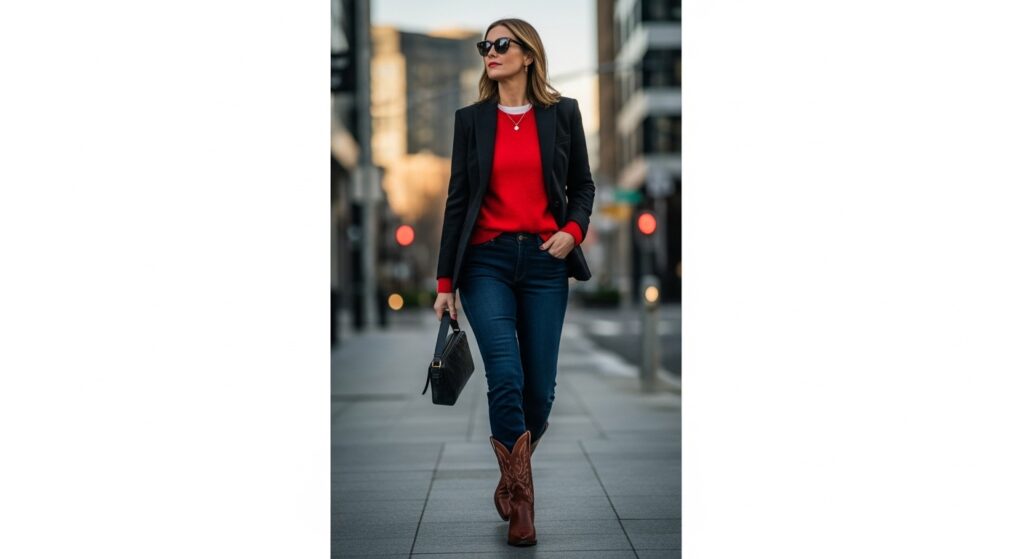 Elevate your red sweater and jeans combination by throwing a structured blazer over the top. A black, navy, or plaid blazer can instantly make the outfit feel more professional and chic. It’s a fantastic power-dressing move that cleverly blends casual comfort with sharp tailoring. The cowboy boots underneath it all signal a confident and fashion-forward attitude. A classic like the Cicy Bell Women’s Casual Blazer is a versatile choice.