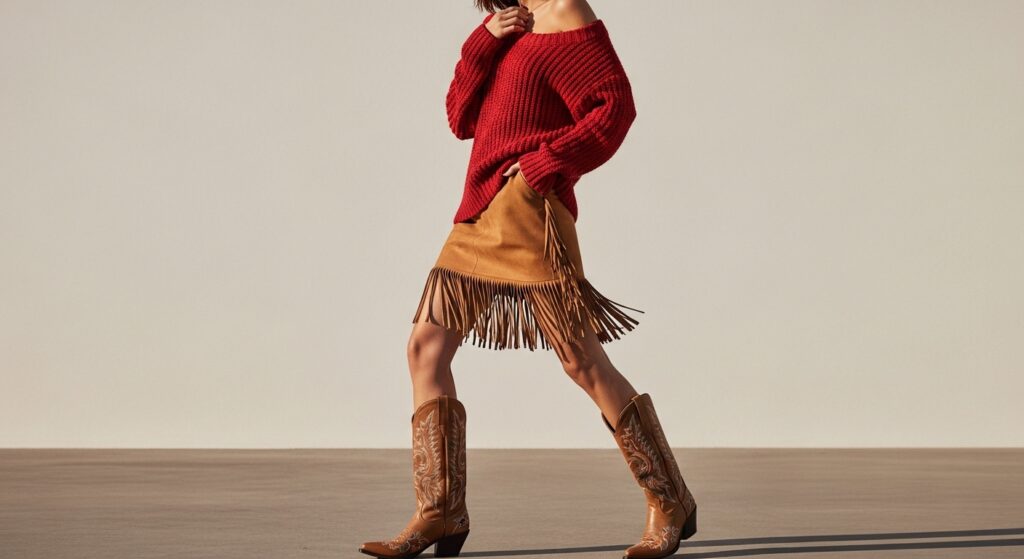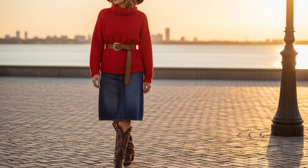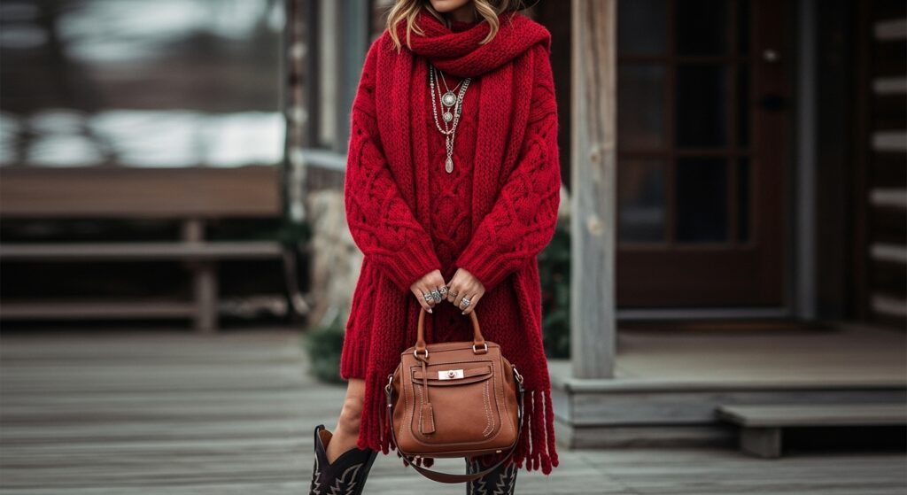 As you can see, the red sweater and cowboy boot combination is a true style chameleon. From classic denim pairings to edgy leather and feminine skirts, the possibilities are virtually endless. This duo empowers you to express your personality, blending comfort with undeniable chic. Don’t be afraid to experiment with different textures, layers, and accessories to make these looks your own. Step out with confidence and let your bold, western-inspired style shine through in every season.
