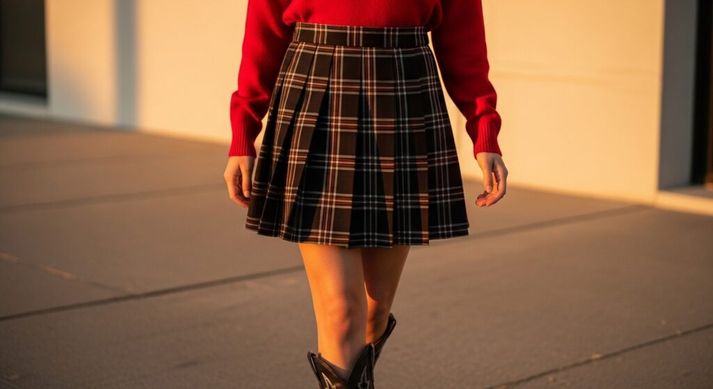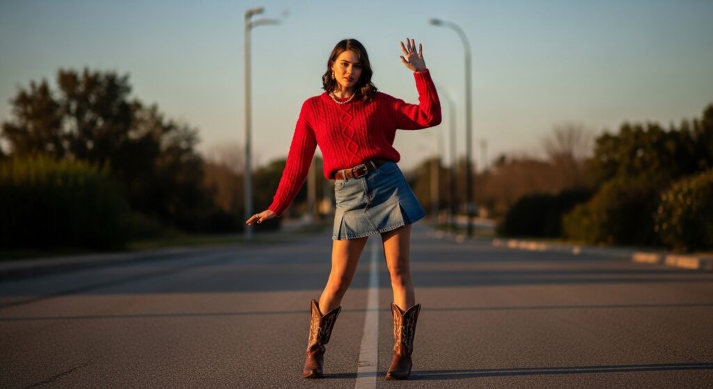 Embrace a touch of academic chic by pairing a fine-knit red sweater with a classic plaid mini skirt. This look is preppy, polished, and full of personality. Tucking in the sweater defines your waist, while the cowboy boots add a rebellious, western edge that keeps the outfit from feeling too traditional. It’s the perfect blend of sweet and sassy. A skirt like the Floerns Women’s Plaid A-Line Mini Skirt would be ideal.
