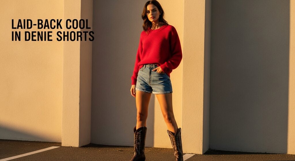 Don’t pack away your shorts just yet! An oversized red sweater with denim cutoff shorts is the ultimate transitional outfit. It’s a stylishly laid-back look that’s perfect for those days that start cool and warm up. The cowboy boots tie it all together, adding a western edge and a bit of unexpected polish to an otherwise casual ensemble. For a classic foundation, you can’t go wrong with Levi’s Women’s Mid-Length Shorts.