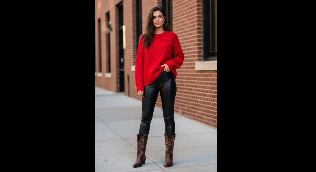Unleash your inner rockstar by pairing an oversized red sweater with faux leather leggings. The contrast between the soft, cozy knit and the sleek, edgy leather creates a dynamic and eye-catching look. The cowboy boots add an unexpected twist, blending western ruggedness with urban chic. This outfit is all about confidence and making a statement wherever you go. Consider pairing it with the popular SATINA High Waisted Faux Leather Leggings.