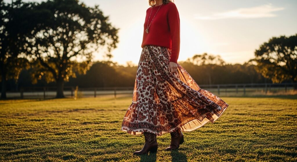 Create a stunning bohemian look by pairing your red sweater with a flowy, patterned maxi skirt. The combination of the structured sweater and the loose, romantic skirt creates a beautiful contrast in silhouettes. Let the sweater hang loose or do a partial tuck for a more defined shape. The cowboy boots add the perfect amount of rustic, free-spirited energy to complete this effortlessly chic outfit. A skirt like the Afibi Women’s Boho Maxi Skirt works beautifully.
