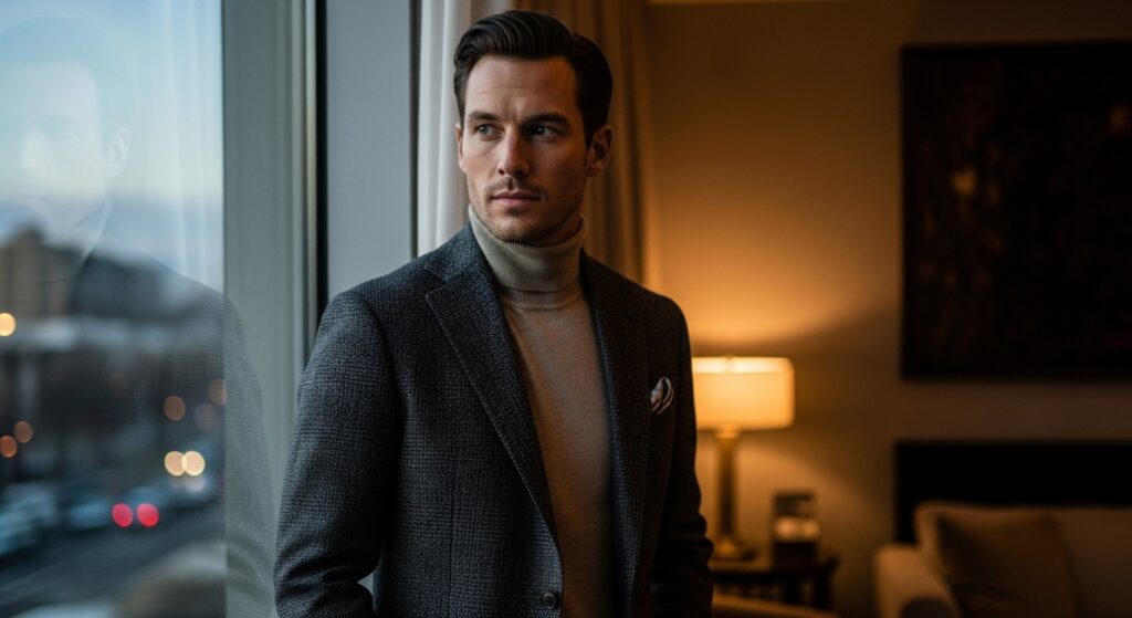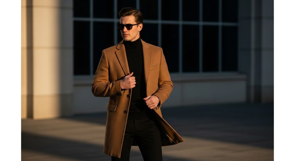 For a sleek, modern, and slightly academic look, swap your collared shirt for a fine-gauge turtleneck. This pairing is exceptionally sharp, especially in monochrome or complementary tones like a camel coat over a black turtleneck. It’s a sophisticated choice for cooler months that adds warmth and a dose of continental flair. The Daupanzees Men’s Slim Fit Casual Blazer pairs beautifully with this style.