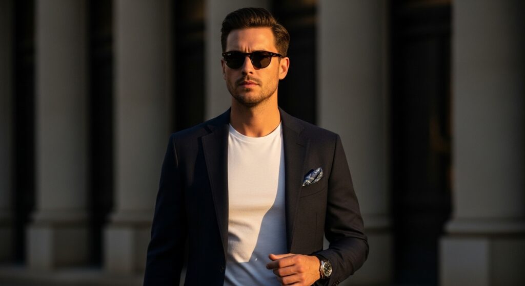 The ultimate high-low combination, layering a sport coat over a simple, high-quality crewneck t-shirt is the epitome of modern smart-casual. This look is comfortable, stylish, and incredibly versatile. Opt for a clean, plain t-shirt in white, black, or grey to keep the look sharp and uncluttered. You can elevate this outfit with a versatile piece like the Goodthreads Men’s Slim-Fit Stretch Blazer.