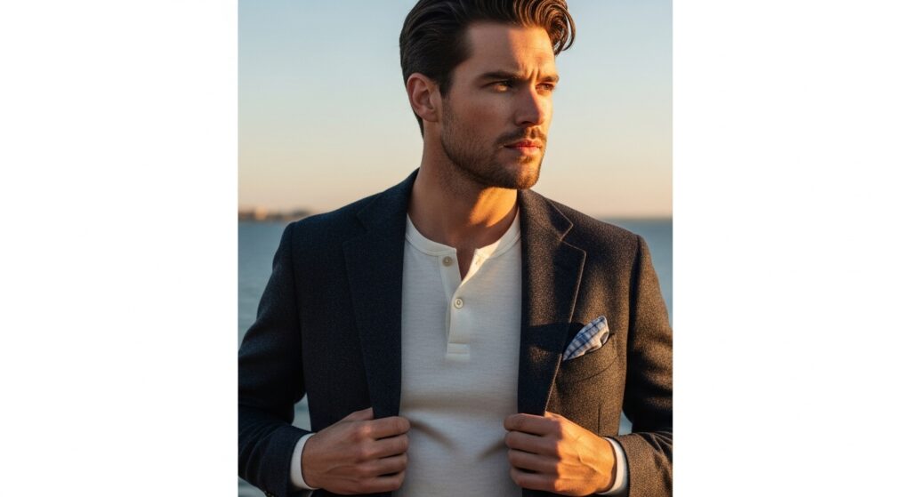 For a step up from the t-shirt but more casual than a collared shirt, try layering your sport coat over a Henley. This combination leans into a rugged, masculine aesthetic, especially with a more textured jacket like tweed or corduroy. It’s a comfortable and stylish choice for a weekend coffee run or a casual get-together with friends. To achieve this, try pairing a jacket like the APTRO Men’s Casual Blazer with your favorite Henley.