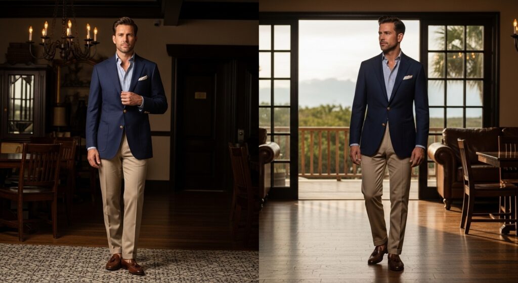 This is the quintessential preppy combination, a look that never fails. The deep navy of the blazer provides a sharp contrast to the light tan of the khaki trousers, creating a balanced and polished aesthetic perfect for anything from a casual Friday at the office to a garden party. It’s a reliable foundation for any man’s wardrobe. For a classic option, check out the Haggar Men’s In-Motion Classic Fit Blazer.