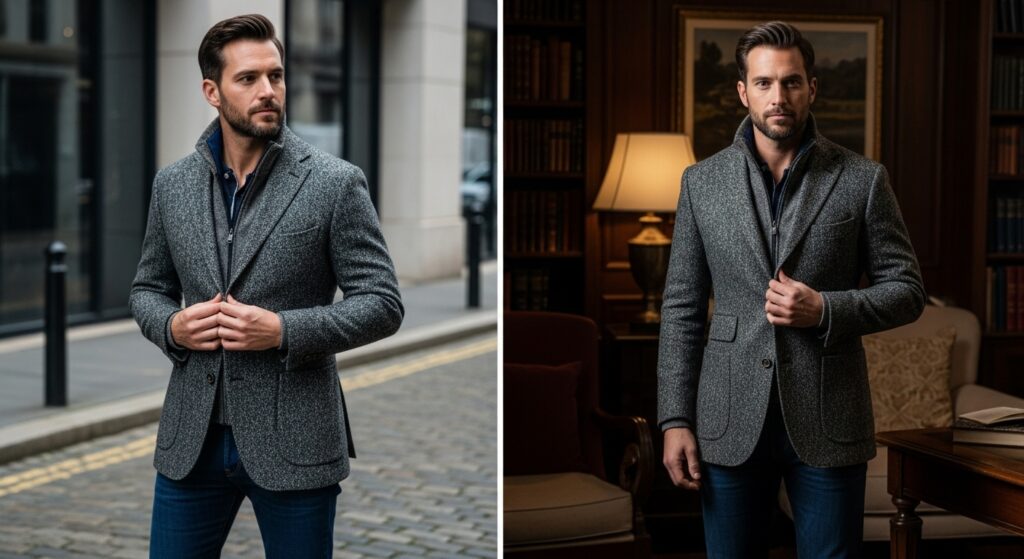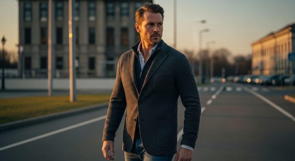 Channel a sophisticated, rustic charm by pairing a textured grey tweed sport coat with a pair of well-fitting dark wash jeans. This outfit is perfect for autumn and winter, offering warmth, texture, and an air of intellectual cool. It’s a fantastic way to look put-together without appearing overly formal. Consider adding a piece like the Cloudstyle Men’s Wool Blend Tweed Blazer to your collection.