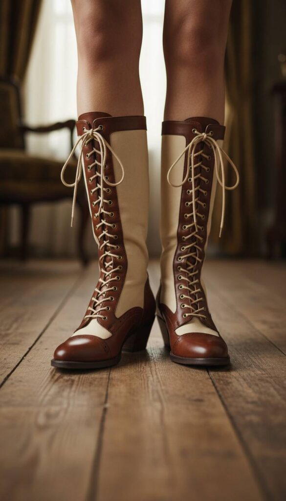 Footwear can make or break an outfit, and in this genre, the ‘Granny Boot’ reigns supreme. You want a mid-calf or knee-high boot with intricate lacing. While brown and black are standard, oxblood or two-tone leather adds a fantastic pop of character. Ensure they have a sturdy, block heel because you will likely be on your feet all day. These look incredible peeking out from under a bustle skirt or tucked into jodhpurs.